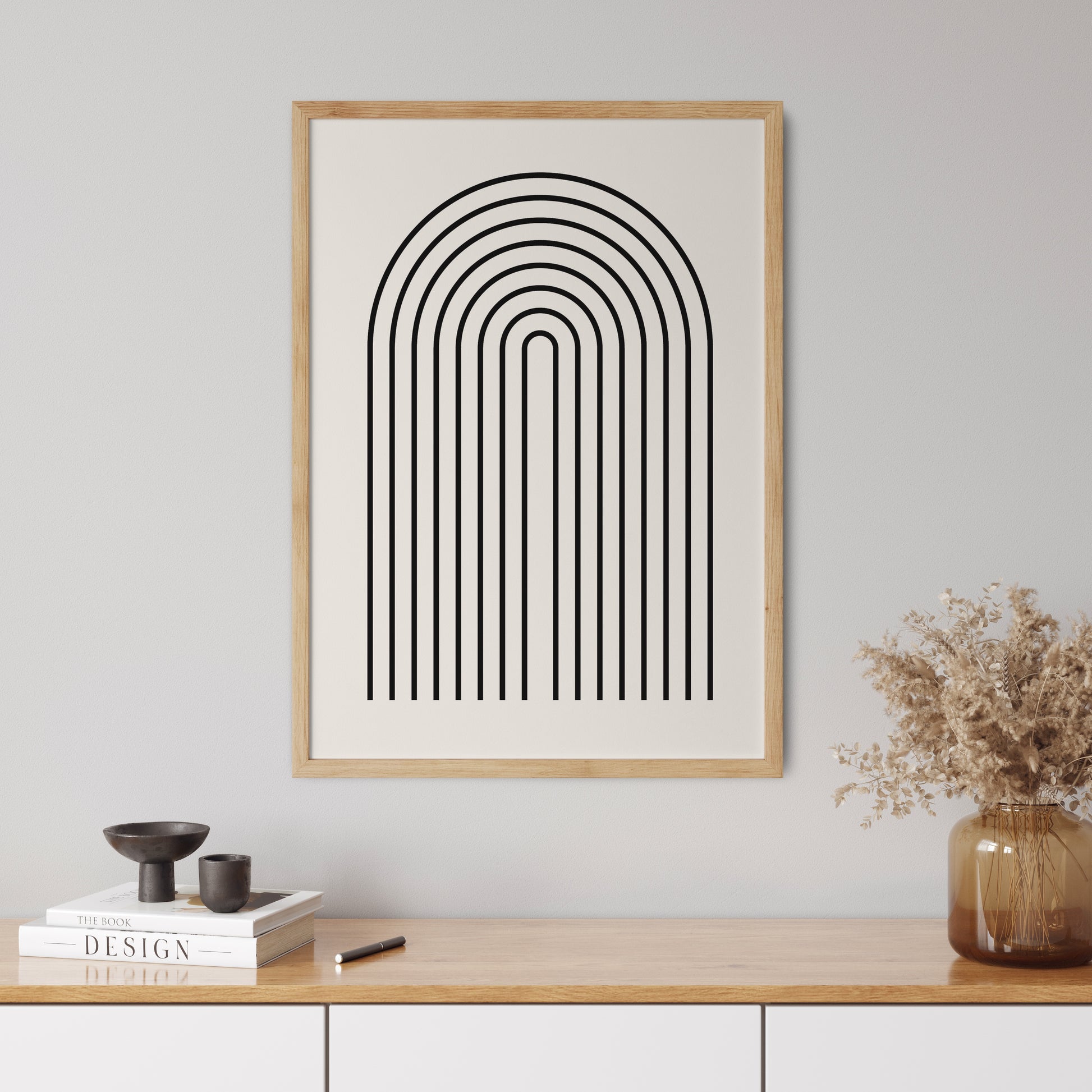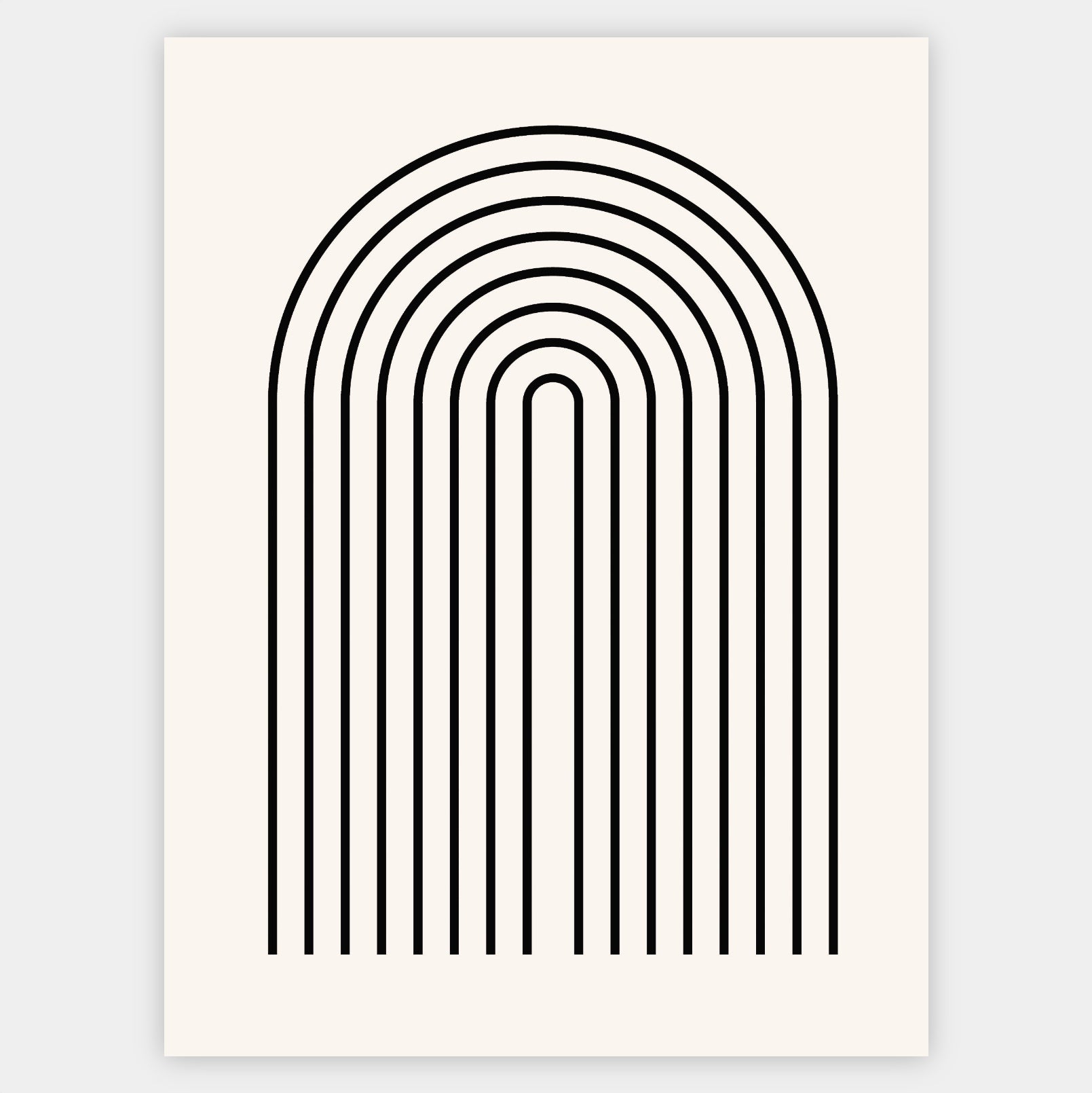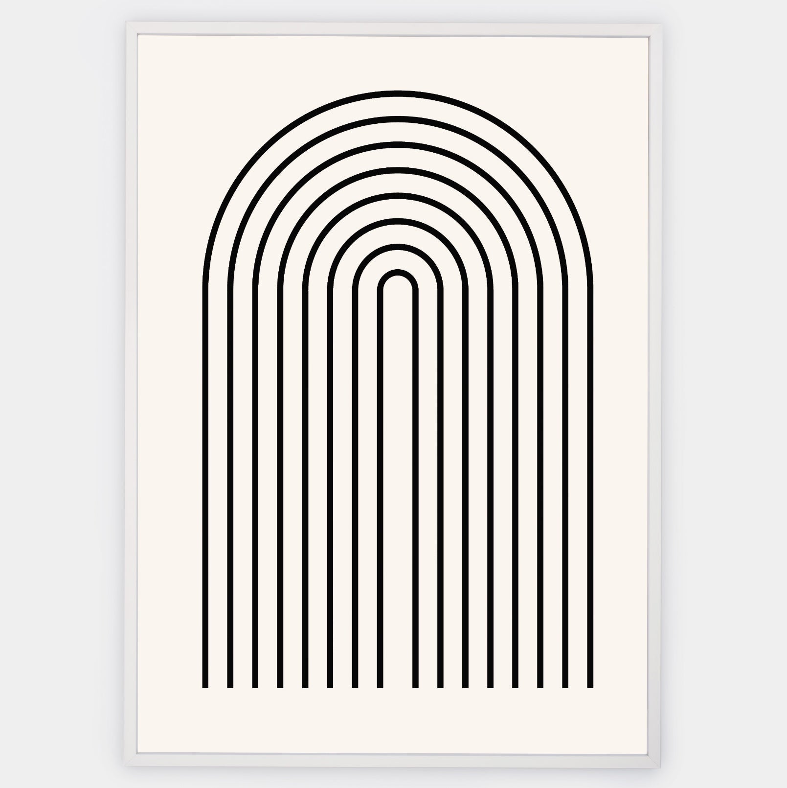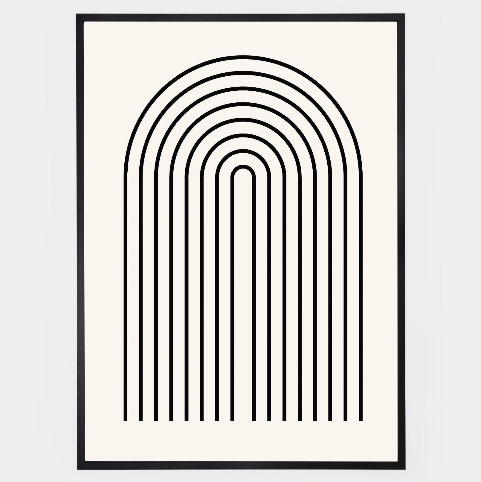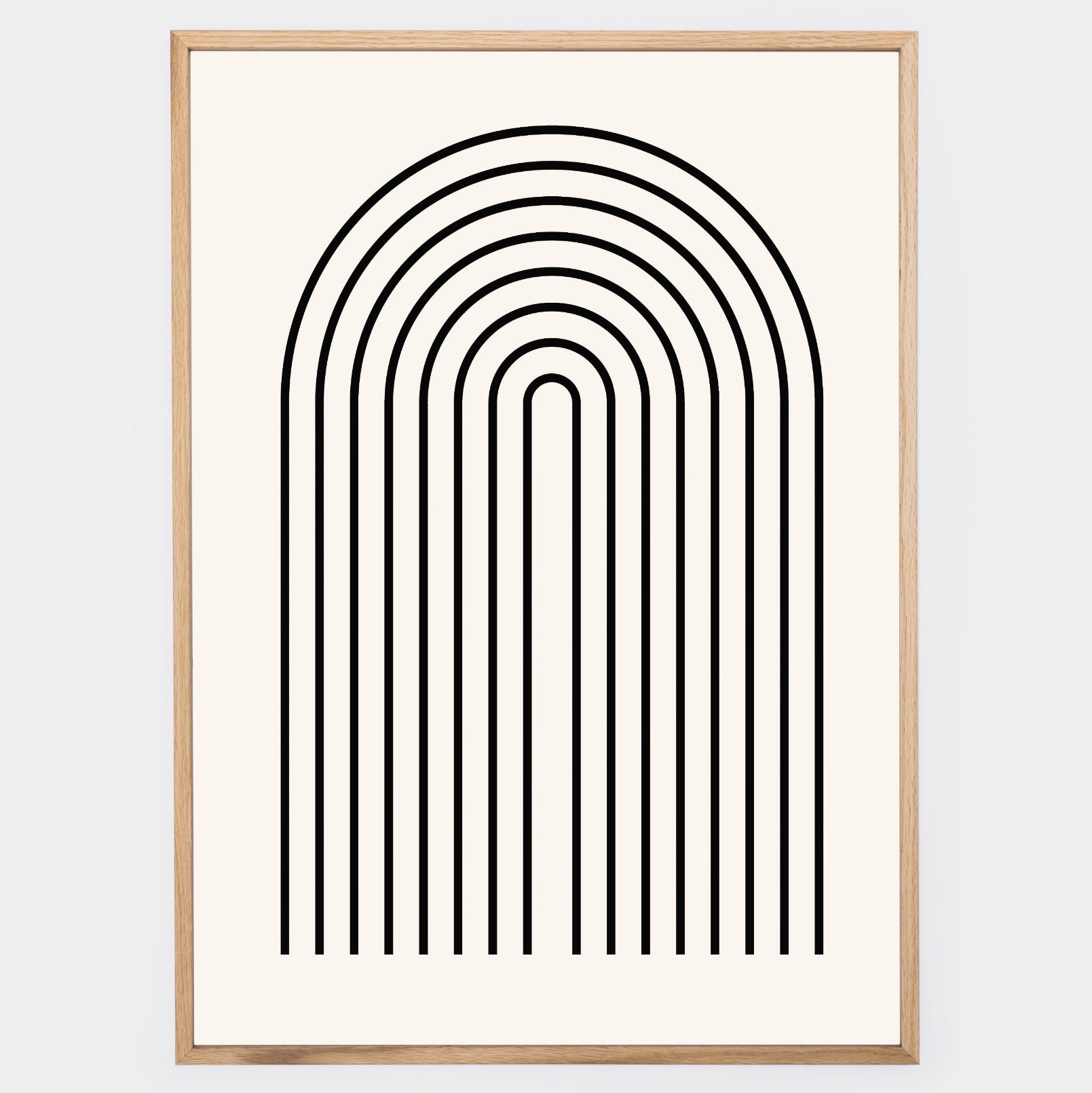 Boho plagát s grafikou oblúkov "The Arc". Poster sa predáva bez rámu s možnosťou doobjednať tenký drevený rám o hrúbke 1,2 cm. Na výber sú tri farebné prevedenia - bielyčierny a dubový dizajn.
