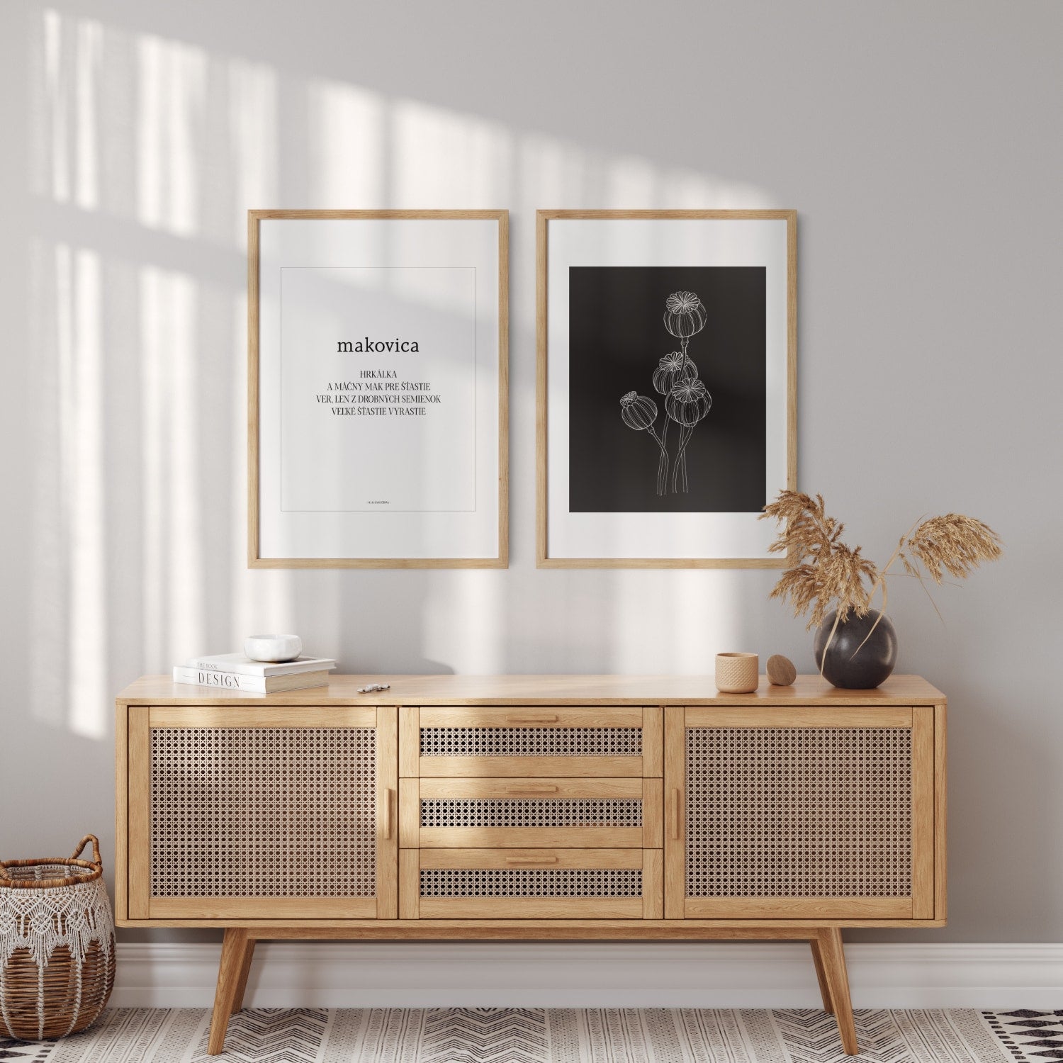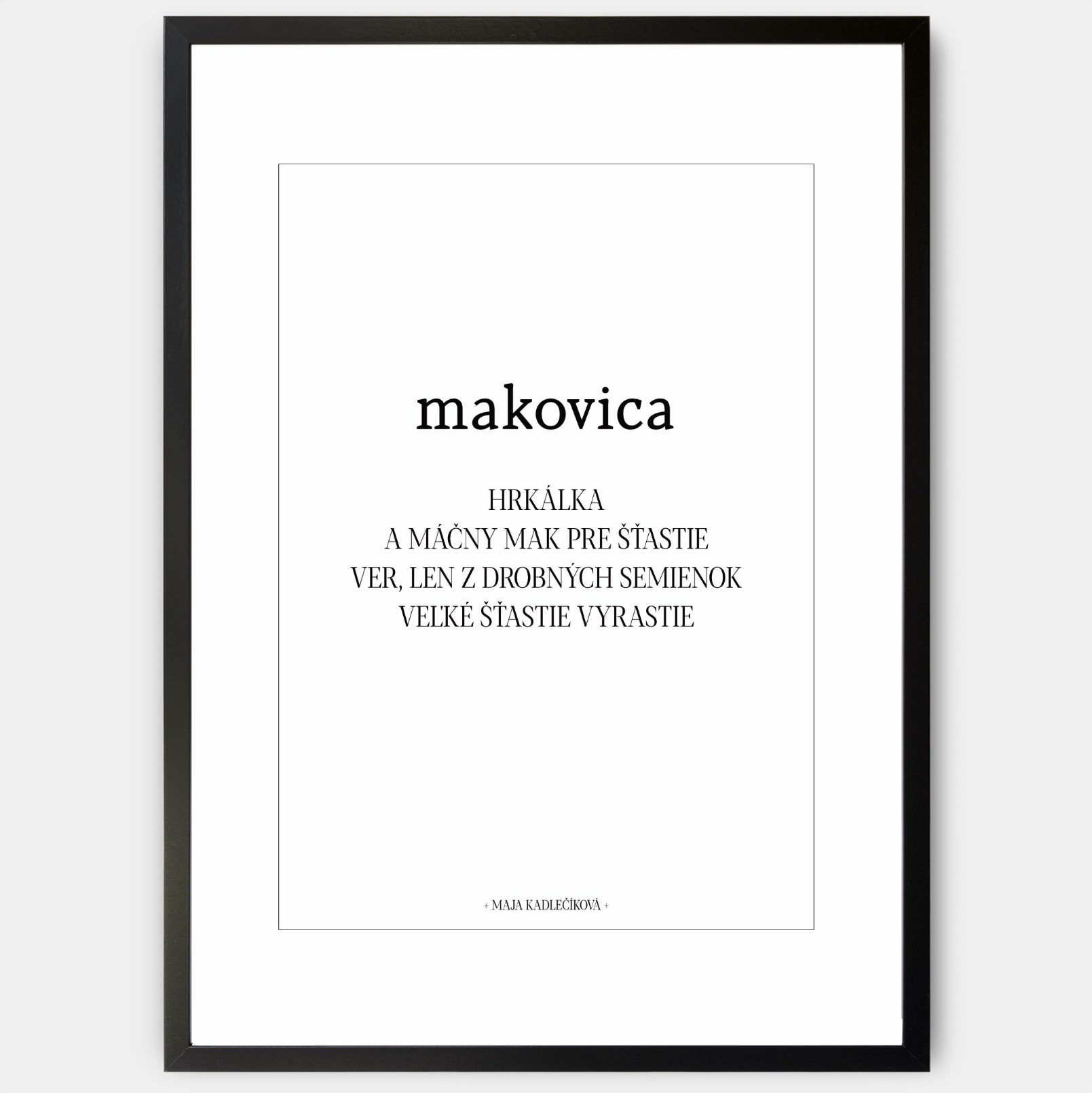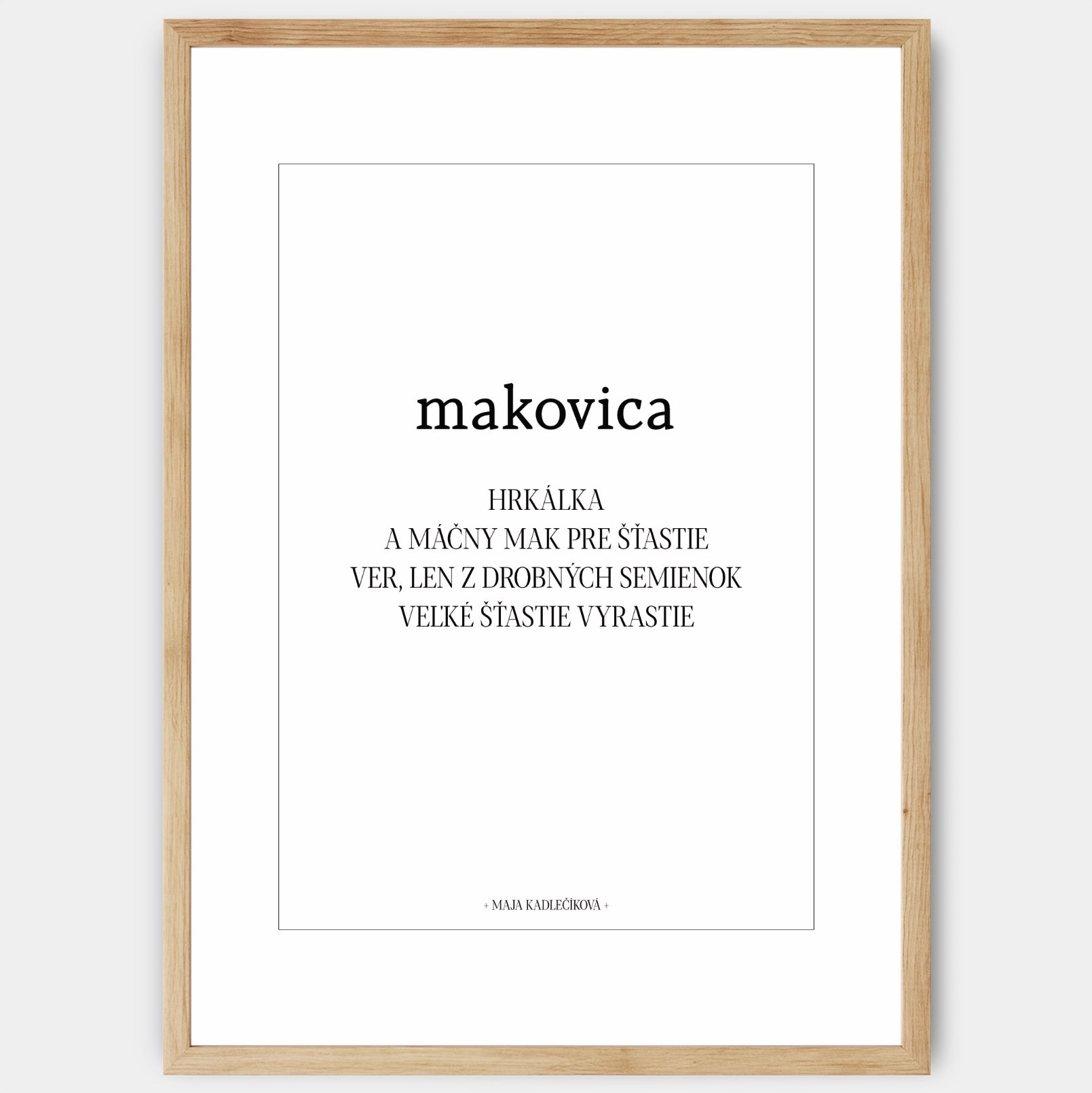 Plagát s básňou "Makovica" z kolekcie Noc a Deň dopĺňa rovnomenný plagát s vizuálom makovíc. Je navrhnutý tak, aby ho bolo možné doplniť o štandardnú paspartu. Poster sa predáva bez rámu s možnosťou doobjednať tenký drevený rám o hrúbke 1,2 cm. Na výber sú tri farebné prevedenia - biely, čiernydubový dizajn.