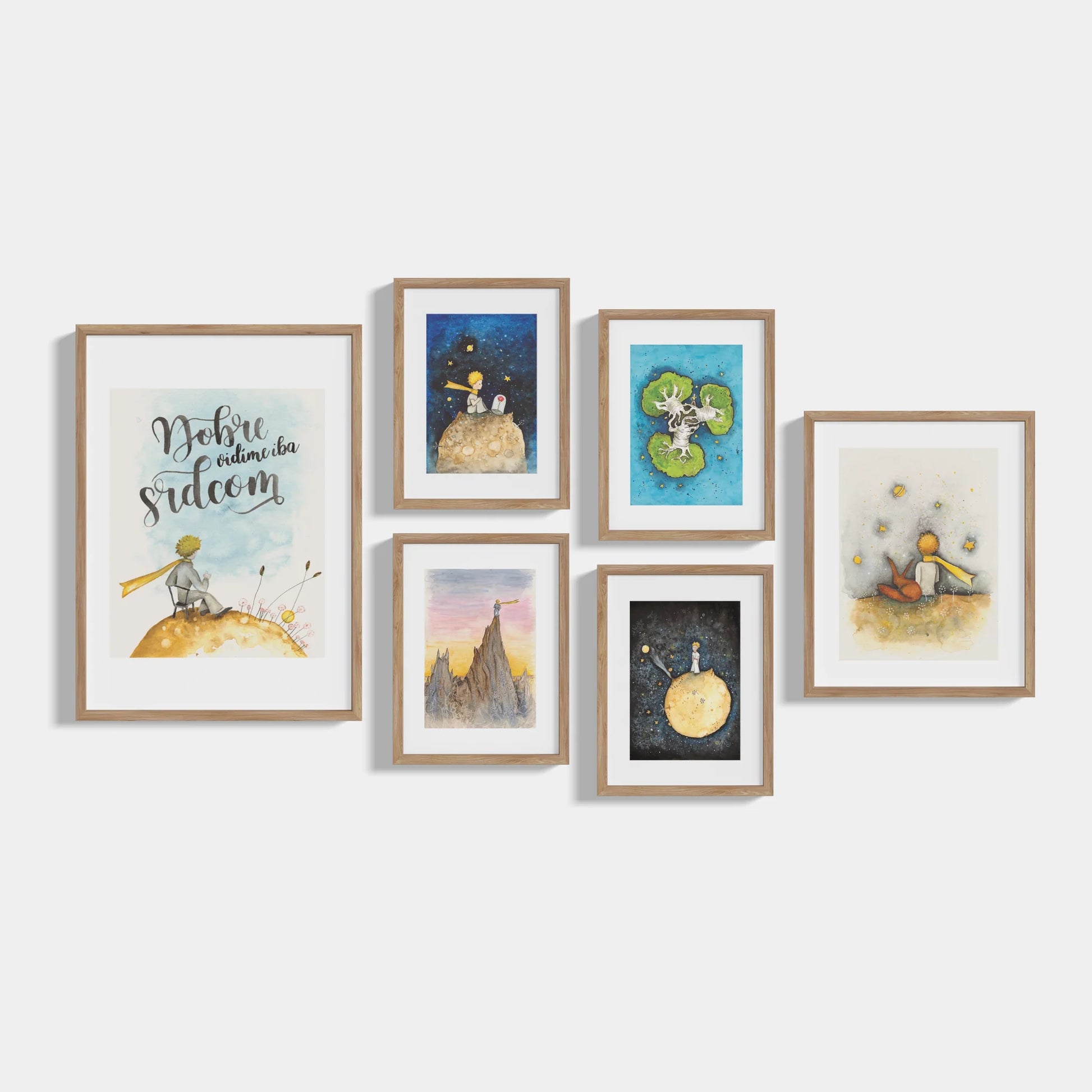 Zostava šiestich plagátov s motívom Malého princa. Obsahuje 1 plagát rozmeru 50x70cm, 1 plagát 40x50cm a 4 plagáty rozmeru 30x40 cm, bez rámov. Vizuály sú prispôsobené tak, aby ich bolo možné doplniť o štandardne predávanú paspartu. K plagátom možno dokúpiť biele, čierne alebo dubové rámy.